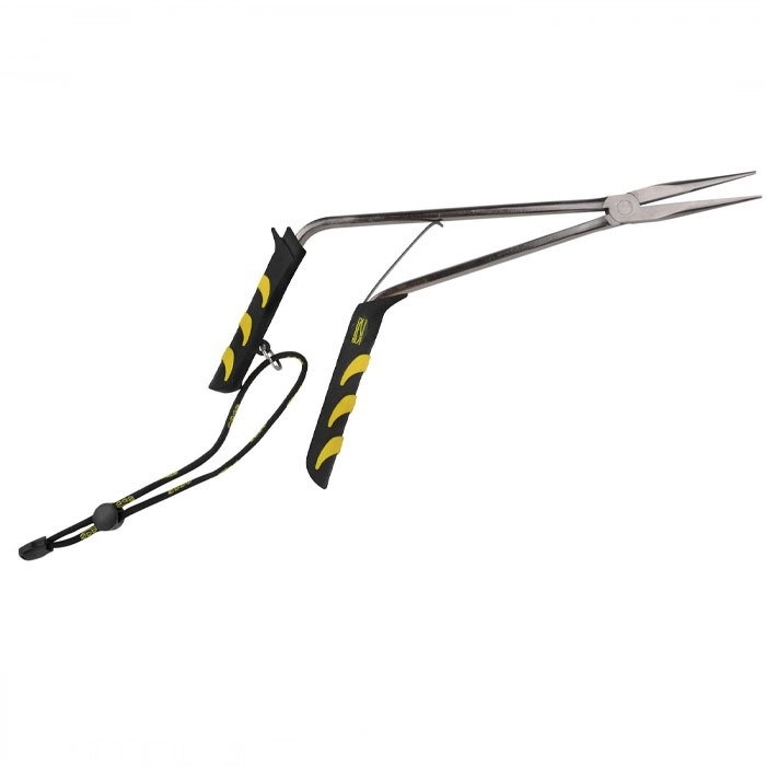 Balığın kolayca kancadan çıkarılması için özel açılı saplı ekstra uzun pense. Merkezi yay, tek elle rahat kullanım sağlar. Turna balıkçılığı için özel olarak geliştirilmiştir.